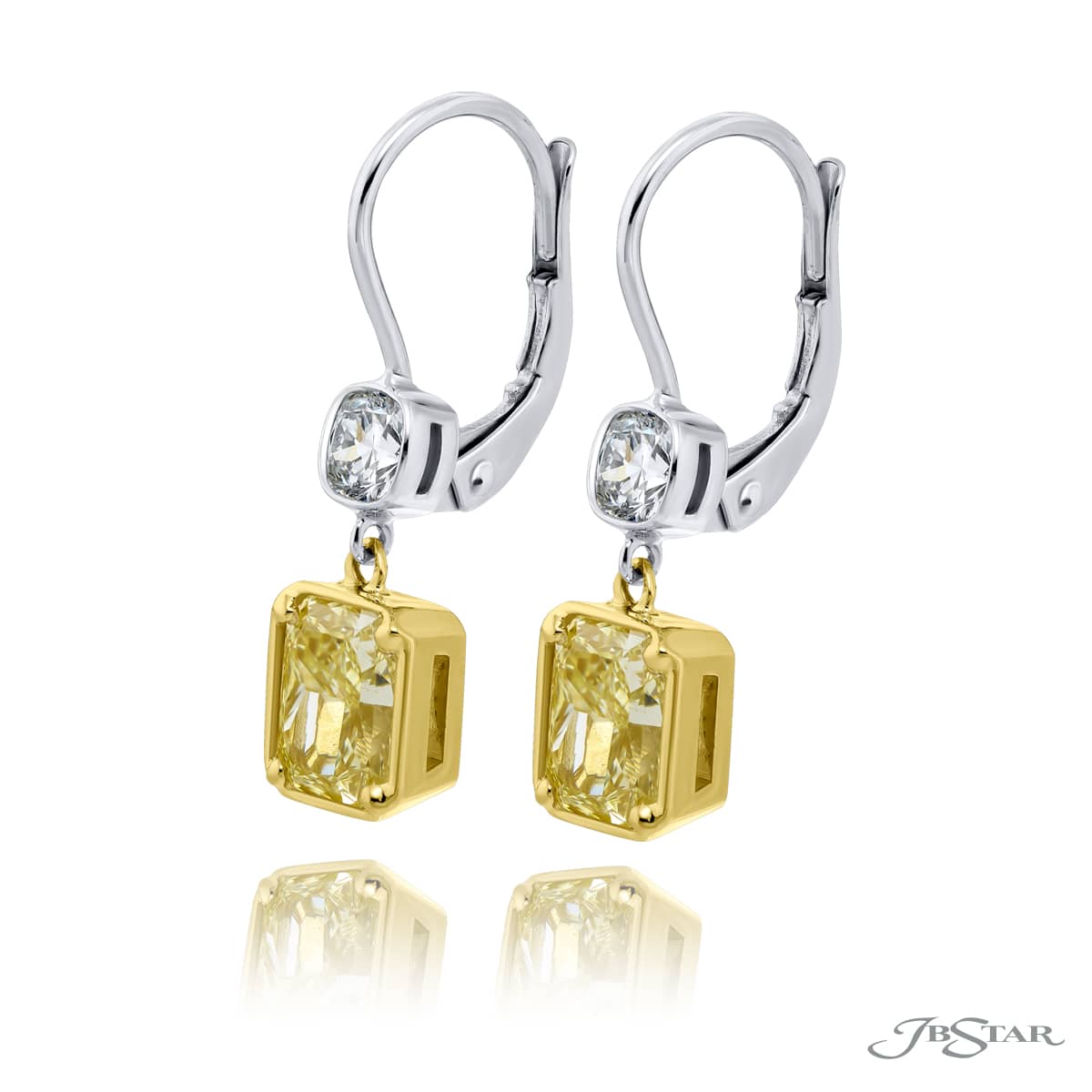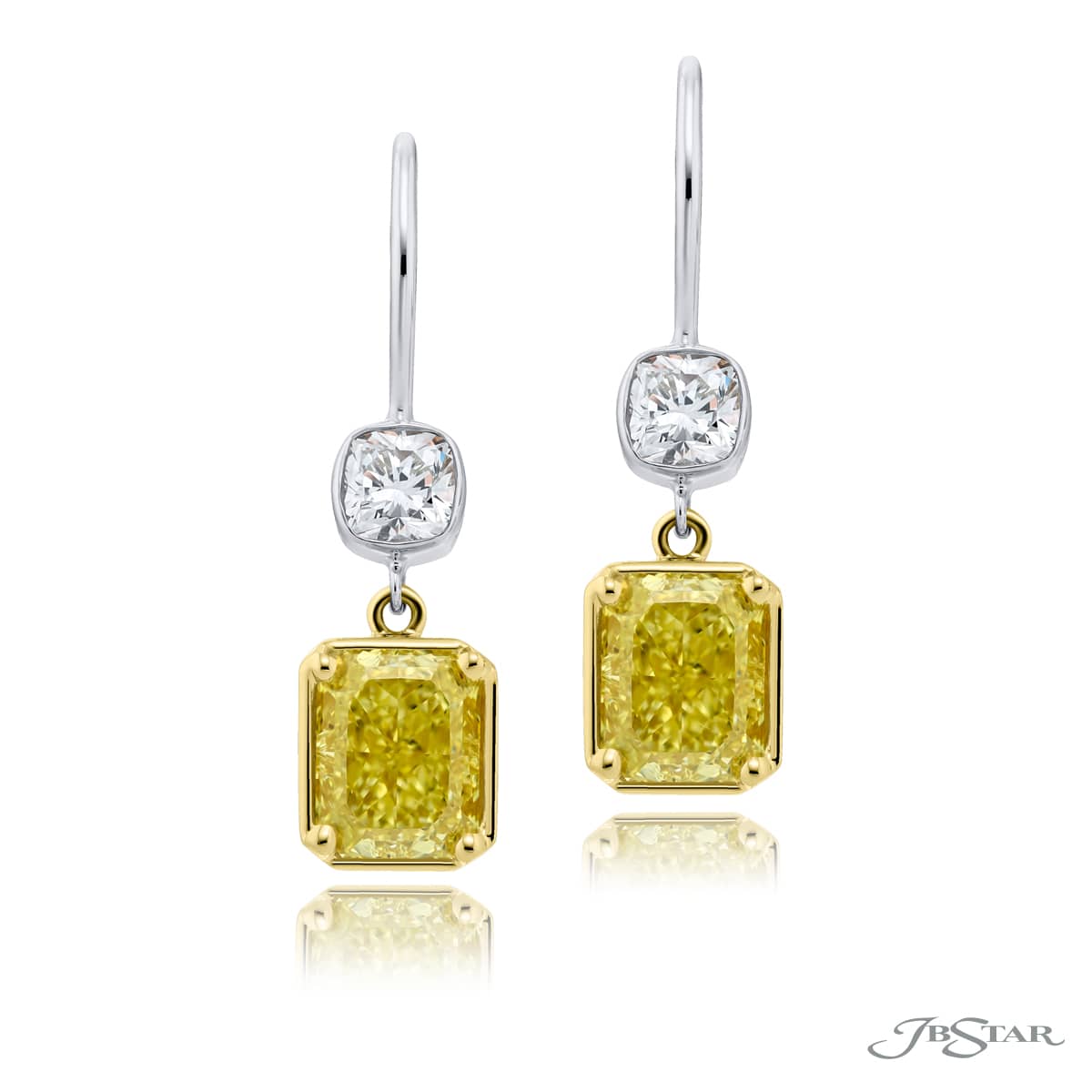 Gorgeous Glamour: Our timeless 3.03 ctw. GIA certified Fancy Yellow Diamond Drop Earrings. These beautiful radiant-cut fancy yellow diamonds hung from shimmering cushion-cut diamonds are handcrafted in 18KY gold.